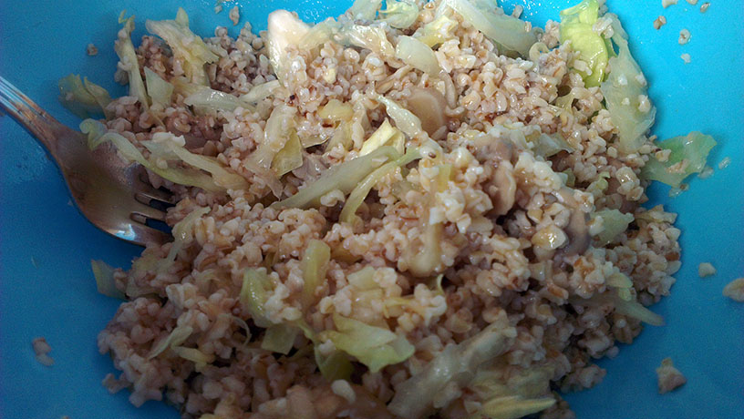 Докато булгурът се отцежда, нарязвате зелето на тънки ивички и го претривате със сол, за да омекне. Зелето е готово, когато стане бистро и започне да пуска водата си. С него също трябва да се внимава, за да не стане прекалено меко и кашаво. След това отцеждате и необходимото ви количество мариновани гъби от консерва. Накрая всички съставки се смесват, като преди това се уверете, че булгурът е добре отцеден. Разбърквате и добавяте зехтина, балсамовия оцет и солта (на вкус). Салатата е добре да престои поне 12 часа преди да бъде консумирана, за да могат съставките (най-вече булгурът) да поеме ароматите и солта. Аз лично я поднасям като самостоятелно ястие, гарнирано с маслини и/или обикновено бяло сирене.