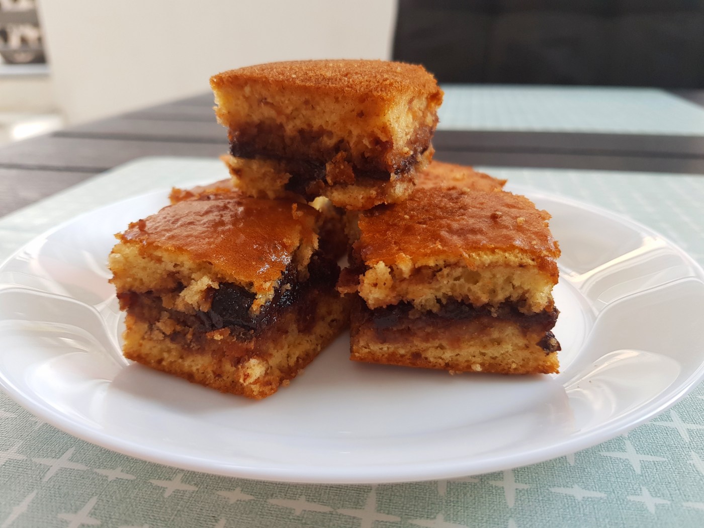 Половината от сместа изсипвам в леко намазнена тавичка. Пека до готовност в предварително загрята за 5 минути фурна на 180°С. Намазвам отгоре със сладкото и върху него изсипвам останалата половина от сместа за кекса. Пека до суха клечка. Отнема всичко на всичко между 30 и 45 минути, като в това време влиза предварителното загряване на фурната и междинното изваждане.