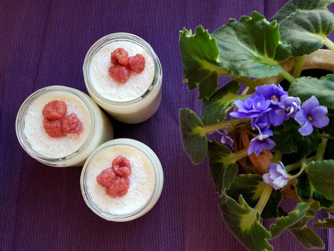 Млякото и водата слагам заедно в тенджера, за да заврат. Когато това стане, добавям гриса (лъжиците са пълни с връх). Бъркам постоянно за 2 минути и свалям от котлона. Изсипвам го в бурканчета, защото така най-точно определям размера на всяка порция. Още докато е топъл, поръсвам отгоре с кокосови стърготини. Когато сервирам, добавям малините.